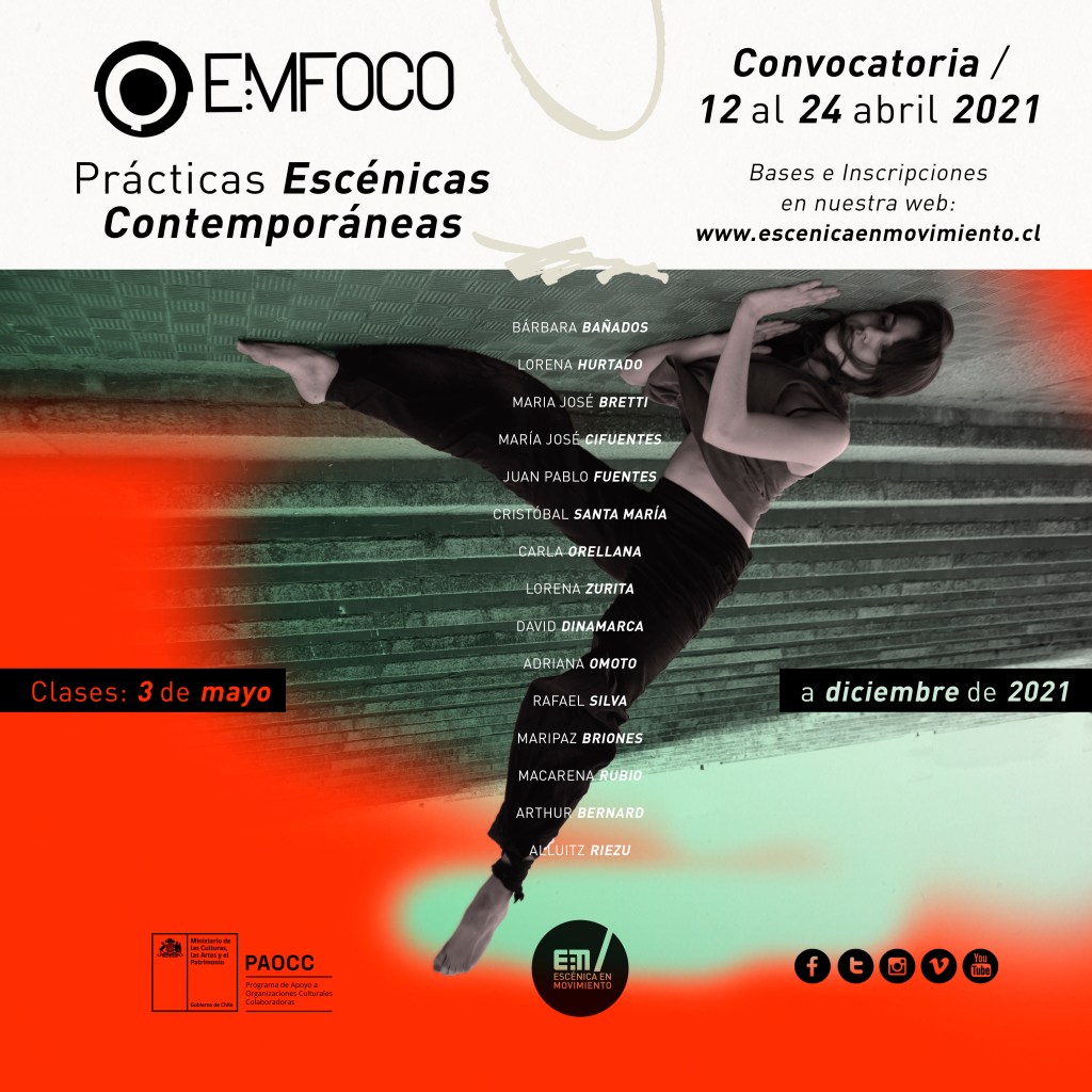 EMFOCO es el área de formación del Centro Cultural Escénica en Movimiento, que lleva realizando una serie de actividades formativas enfocadas en fortalecer la profesionalización de la danza local durante más de cinco años. En esta versión el programa se enfocó en prácticas escénicas contemporáneas con distintas materias inter conectadas y profesionales de la danza que permitieron el desarrollo creativo, interpretativo y teórico de las y los participantes.
